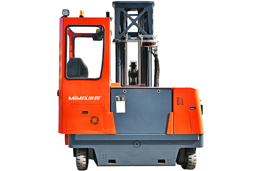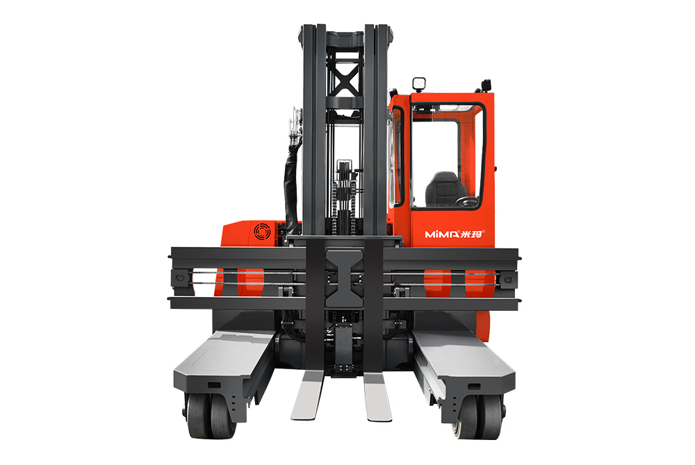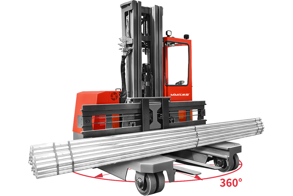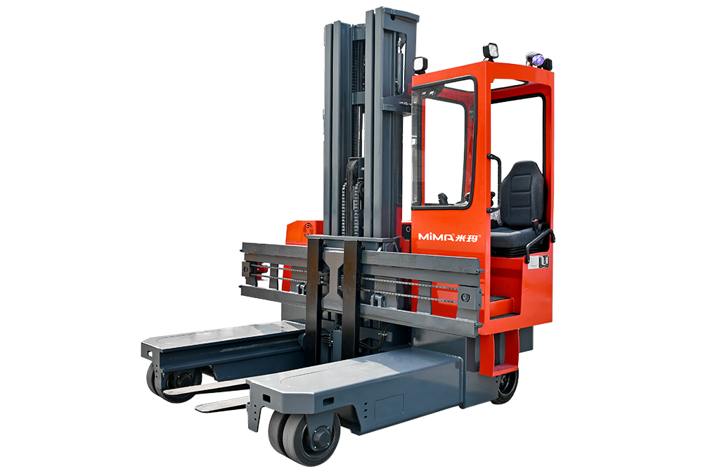 MQC40多向前移式叉車,承載能力4.0噸,門架可以整體前移或縮回,配置有加寬調距貨叉,四輪轉向獨立控制,可以直行、側行、斜行、原地回轉;側行時擁有較小的通道,特別適用于長物料的工況。